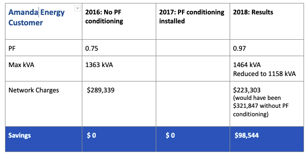 A low power factor, usually under 0.8, equates to significant network charges that are passed through by Western Power. A customer with a PF of 0.8 is paying approximately 20% more in network charges.